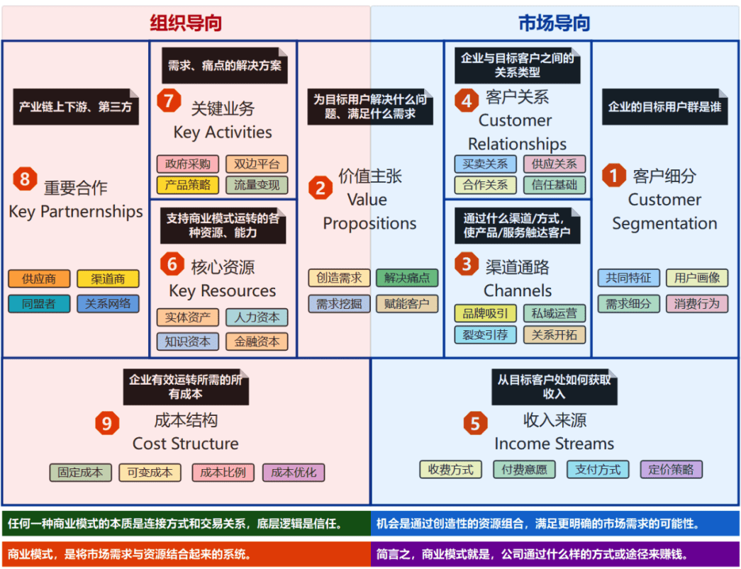 聊经营之前先要聊商业模式,它是企业经营的蓝图,很多创业过的朋友知道,一份BP(Business Plan)中商业模式构建的好坏能直接决定融资路演的成败。商业模型是企业如何创造、传递和捕获价值的方法论和框架,它描述了企业的产品或服务如何满足市场需求,企业如何从客户那里获得收入,以及企业如何组织内部运作和外部合作以实现效益最大化。